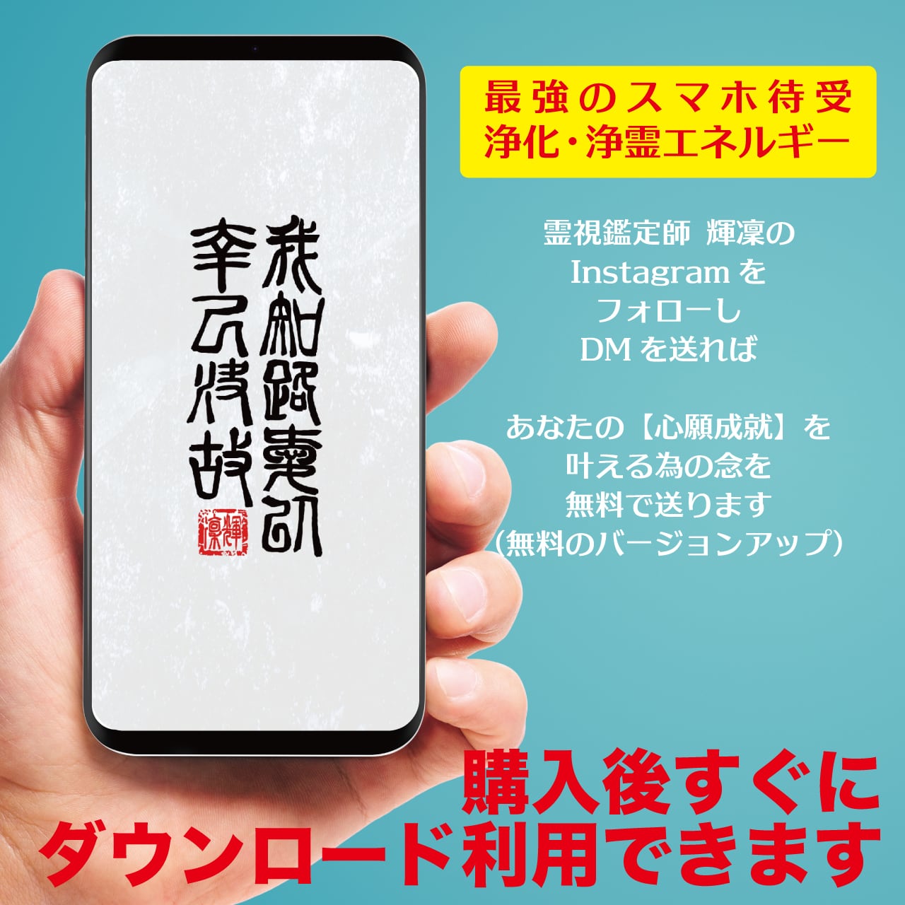 購入(ダウンロード)後にスマホの待受に設定し,霊視鑑定師 輝凜のInstagram宛にDM(メッセージ)を頂ければ,特別な念(周波数)を無料でお込めさせて頂きます。あなたの願い事が1日でも早く叶うようにバージョンアップ可能です。