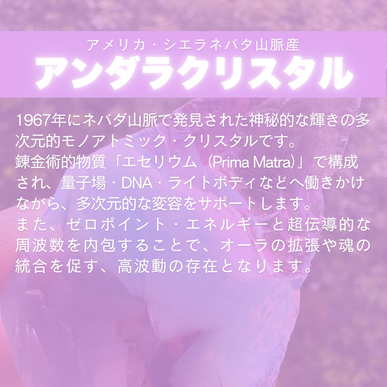 アンダラは大地の奥深くで眠り、時を超えて現れた光の結晶。その姿はまるで宇宙からのかけらのように透き通り、見る者の魂に静かな震えをもたらします。「エセリウム(Prima Matra)」と呼ばれる錬金術的物質を宿し、古代より私たちのDNA・量子意識・ライトボディに共鳴すると伝えられています。その波動はゼロポイントの静けさと超伝導的な周波数・響きを秘め、魂の統合・意識の覚醒・次元上昇をやさしく促してくれるのです。