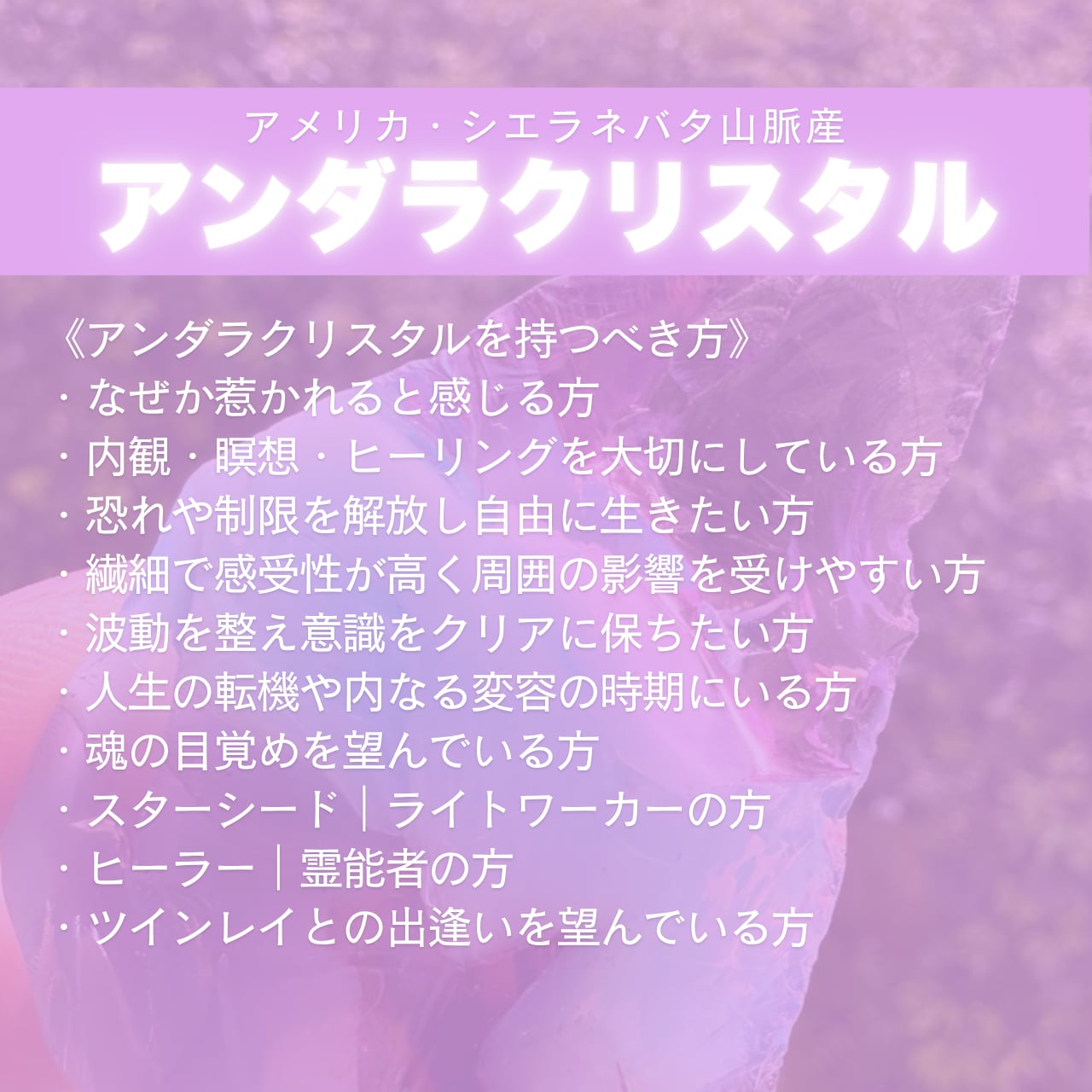 アンダラという名は、レムリアのヒーリング神殿に由来し【光の街】【完全と美の光】を意味すると伝えられています。レムリアやアトランティスの時代、人々はこの結晶を用いて心と魂を癒し、宇宙とつながる聖なる道具として崇めました。