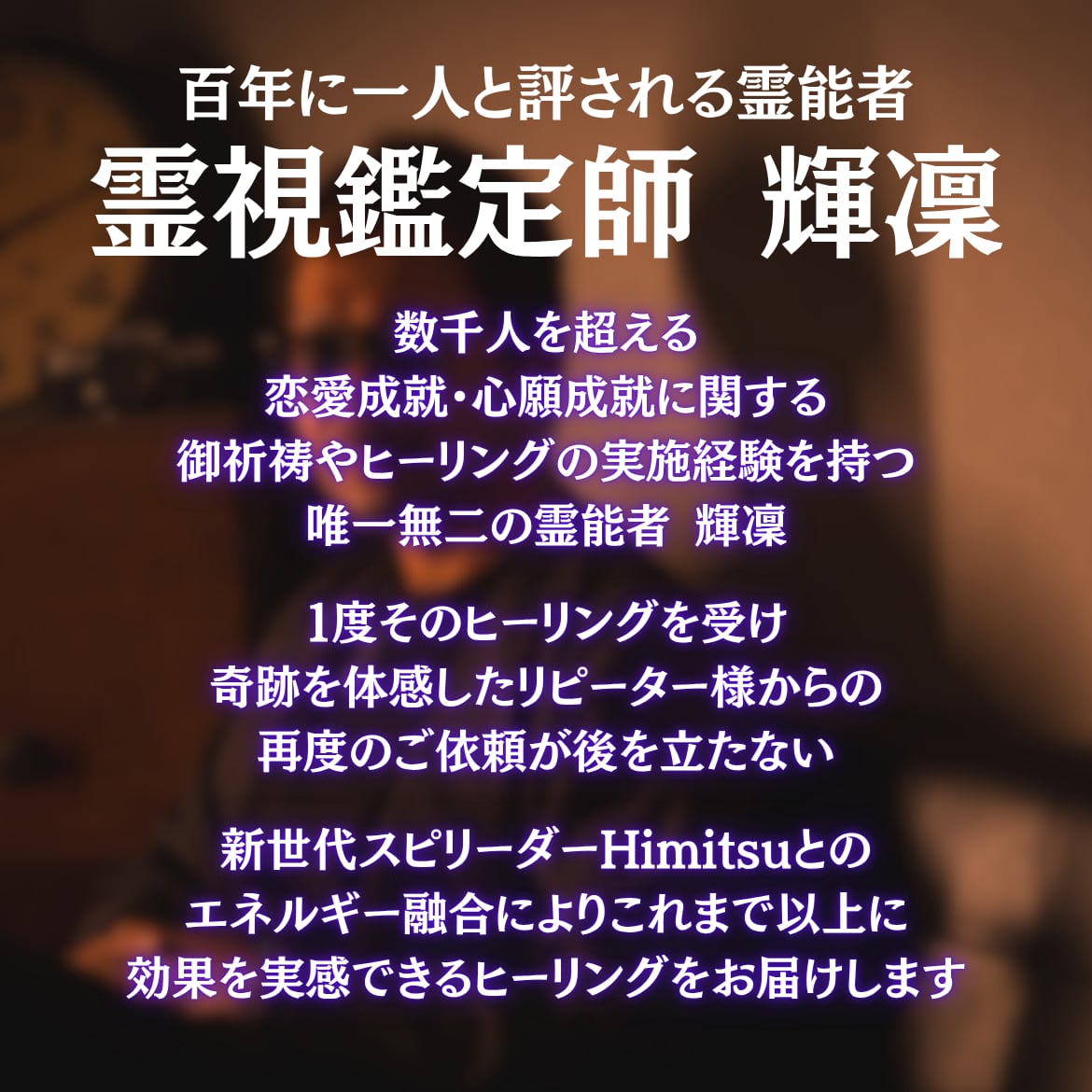 満ちゆく月の光が最高潮に達する特別な夜に、霊視鑑定師 輝凜と秘密の占いHimitsuが、二人の魂に宿るスピリチュアルエネルギーを融合させ、あなたに恋愛成就の奇跡を呼び起こします。