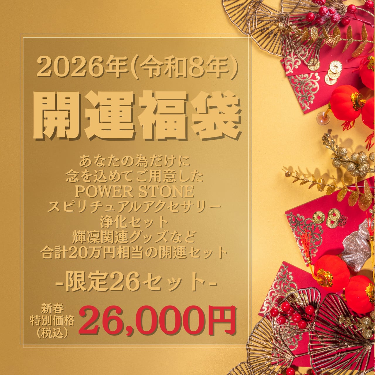 およそ20万円相当の開運・スピリチュアル商品が複数入った開運福袋を、感謝を込めた年に1度の超大特価で限定26セットのみ販売致します。