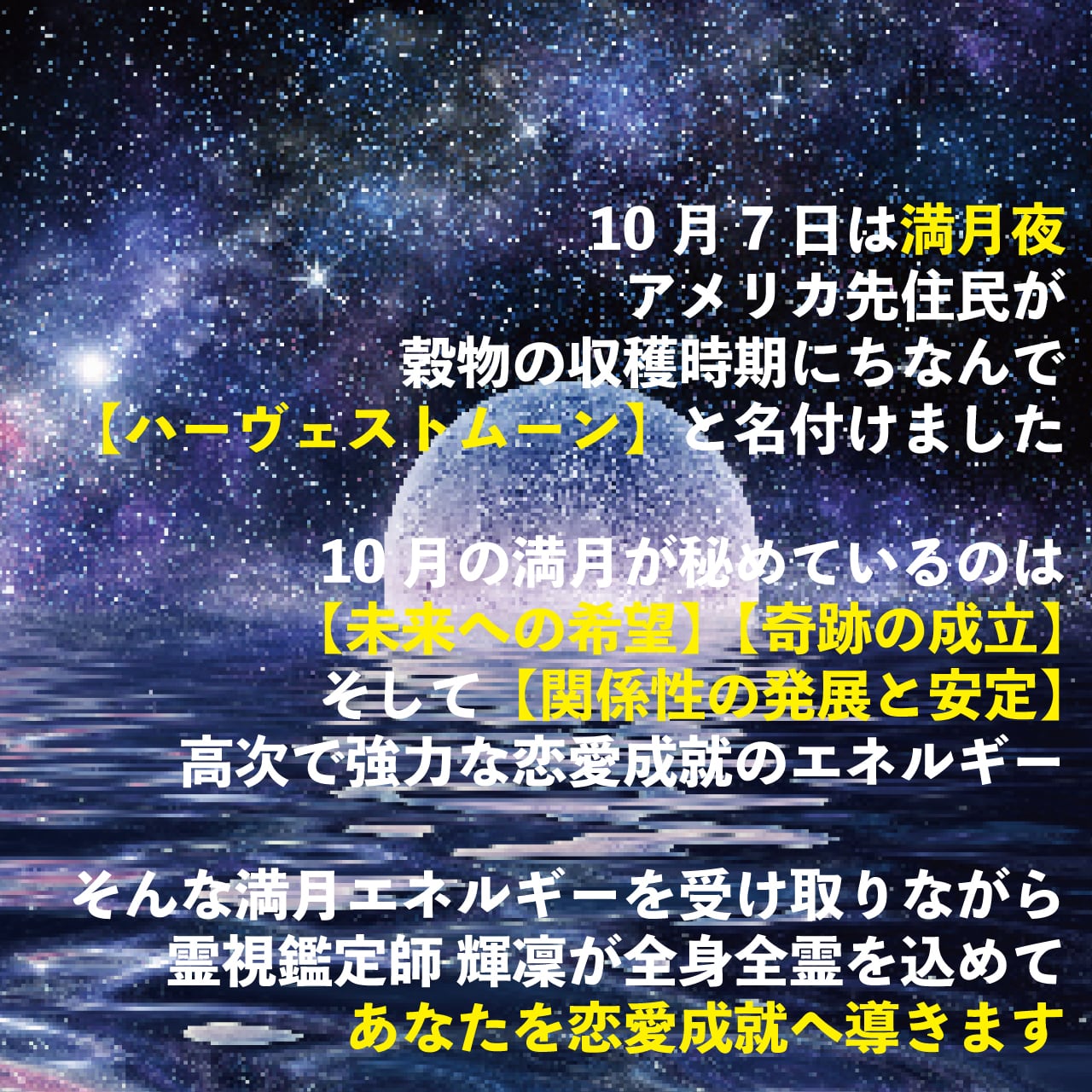 という強烈な恋愛成就のエネルギー。この超高波動のエネルギーを満月から受け取りつつ,霊視鑑定師 輝凜が全身全霊を込めてあなたを恋愛成就へ導きます。